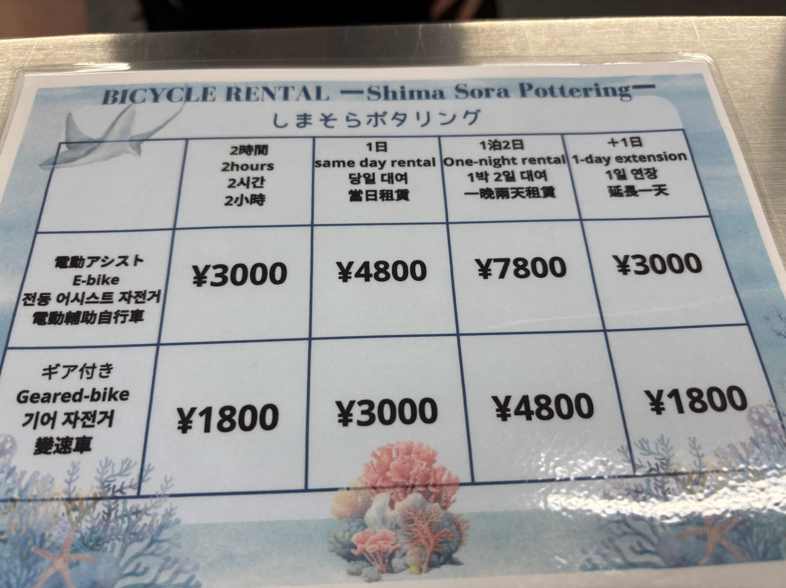「みやこ下地島空港」ターミナルの中で、先ほどの写真にあったなかからレンタルする自転車を選らんだら、簡単な手続き用紙を記入します、内容は自転車のタイプと出発の日時と戻ってくる日時を決めて記入し、もしもの時のための携帯の電話番号と最後に住所を記入して最後に先払いなので、現金またはクレジットカード決済もしくは、PayPay払いでも、可能です。